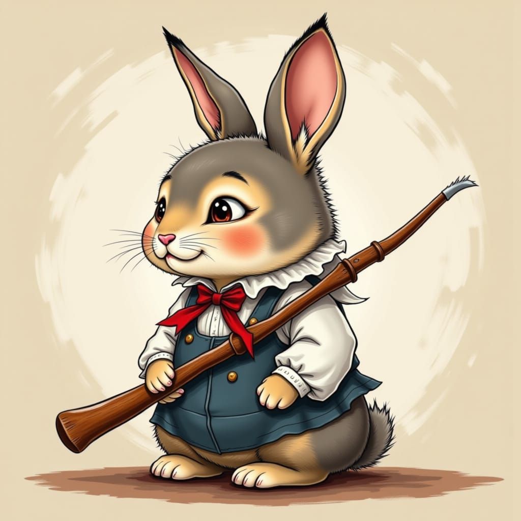 This image shows an adorable bunny tailor. The bunny is depicted in a whimsical, cartoonish style with black accents, created using a LoRA model.