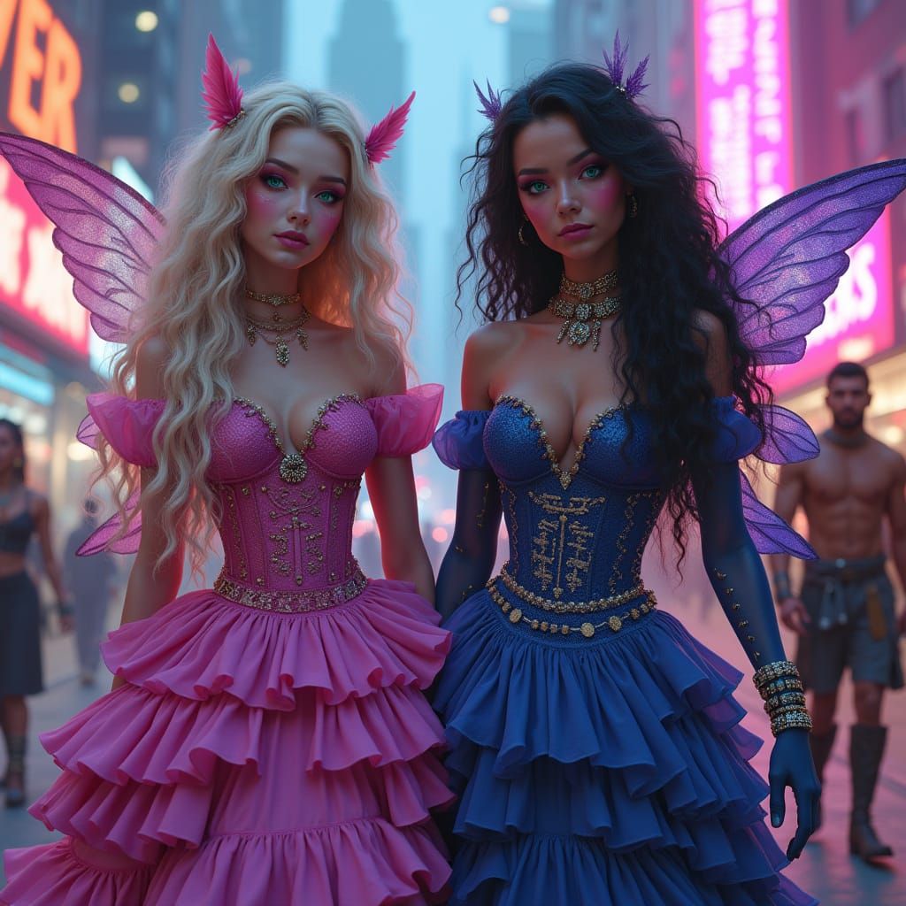 This image depicts two princesses and two fairy princes strolling in a vibrant, neon-lit cityscape, blending cyberpunk and fairy elements with colorful, ornate dresses and regal attire.