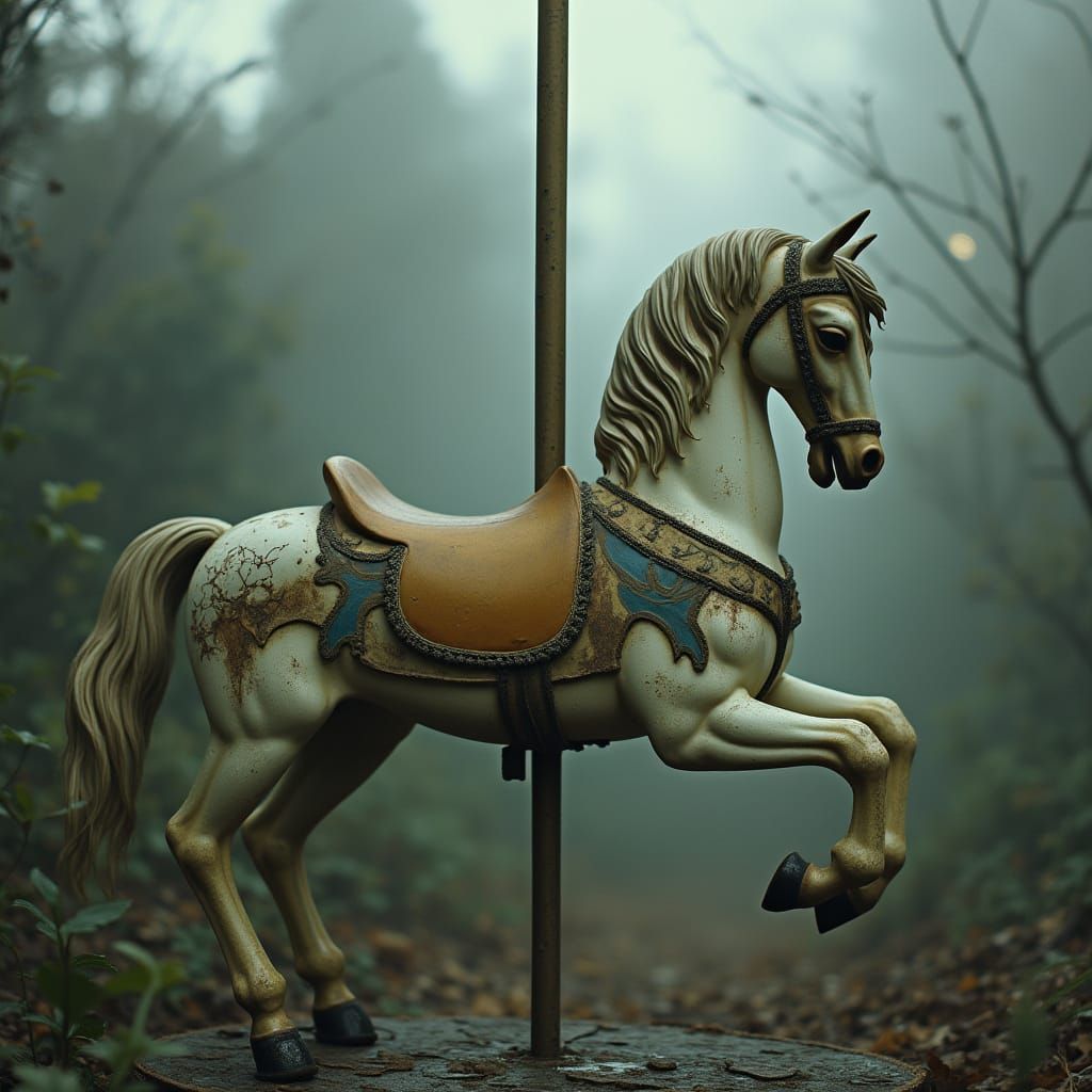A weathered carousel horse captured mid-gallop in a forgotten Victorian garden. This haunting image evokes nostalgia with its soft, grainy texture and surreal, gothic aesthetic.