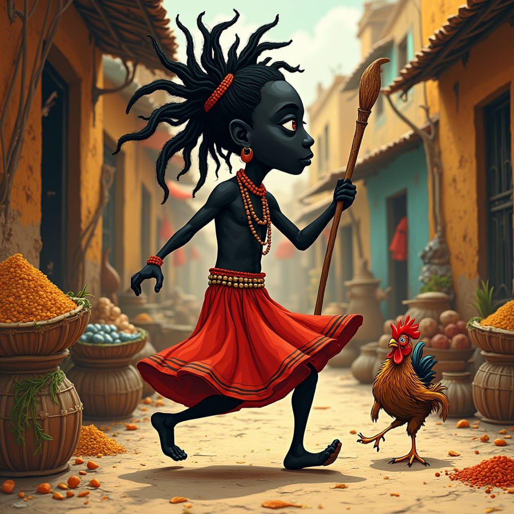 This image shows a dynamic scene of Elegua, a young African boy, dancing through a bustling marketplace. He is surrounded by vibrant colors and lively energy, with a playful rooster by his side.
