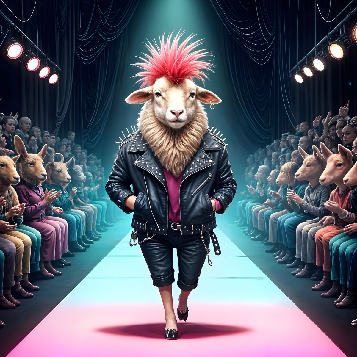 A sheep strutting down a runway in full 1980s punk rock couture, wearing a studded leather jacket, safety pin earrings, mohawk wool dyed neon pink, confident attitude, surrounded by a whimsical storybook atmosphere. Painterly style, perfect soft lighting, expressive brushstrokes, dreamlike textures, ...