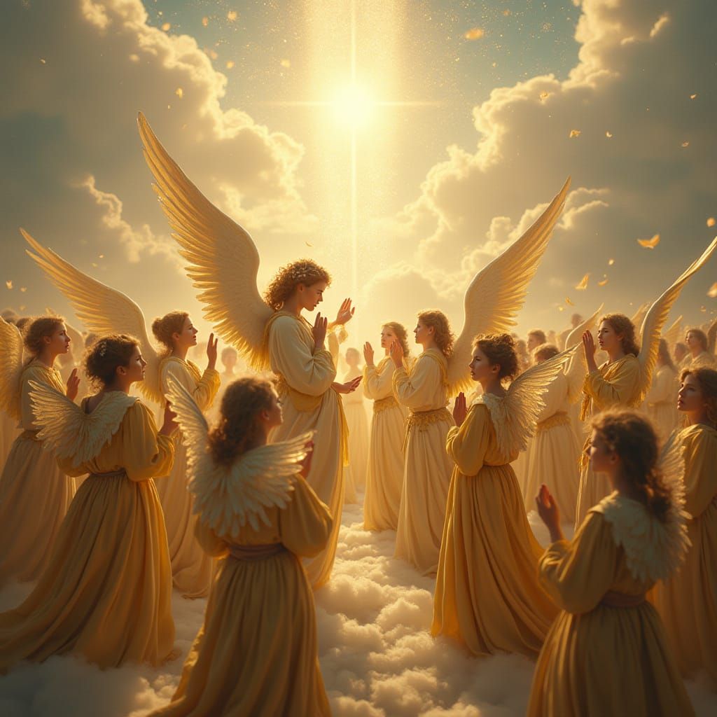 A striking picture of angels in a heavenly kingdom. The celestial scene shows figures in flowing golden robes worshipping amidst luminous clouds, feathers, and shimmering particles in a hyperrealistic style.