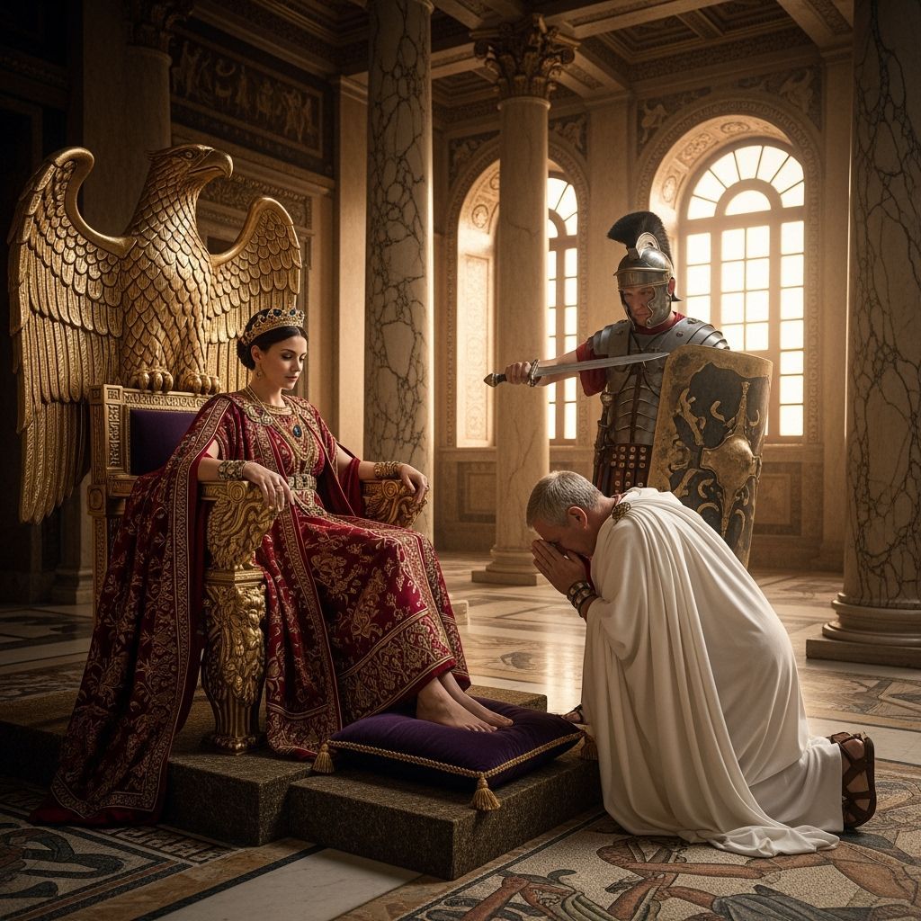 This image shows Empress Messalina on an eagle-shaped throne, attended by a Roman senator and legionnaire in an opulent palace. The scene is depicted with a shallow depth of field.