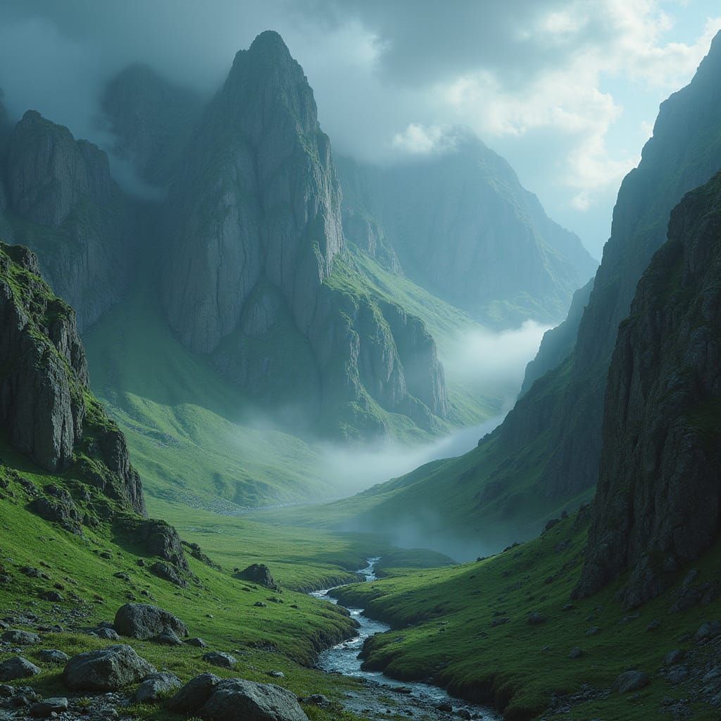 This image shows a mystical mountain pass shrouded in mist, with rugged peaks and lush emerald moors, evoking an atmosphere of adventure and ancient magic, in a style reminiscent of Beksiński's atmospheric works and Alan Lee's vibrant colors.