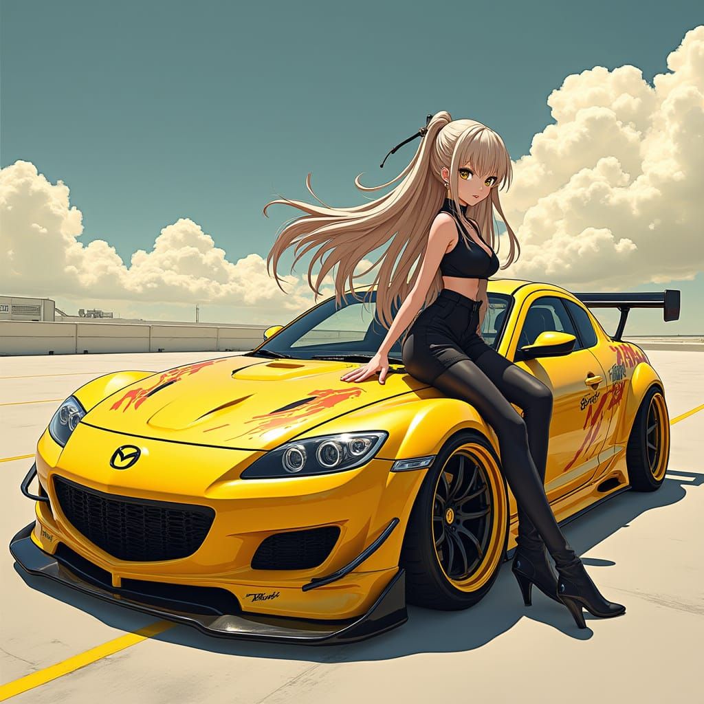 A vibrant yellow Mazda RX-8 with lightning decals and racing modifications is showcased. An anime girl sits on the hood in this image with futuristic and sleek design elements.