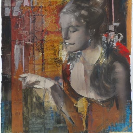 This artwork depicts a material girl focused on acquiring wealth, rendered in a style reminiscent of classical portraiture with modern artistic influences.