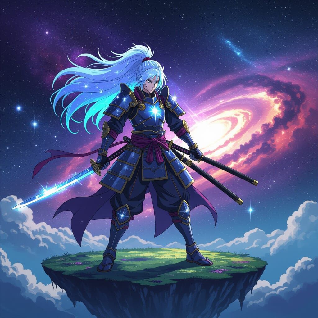 A striking picture of a samurai warrior with flowing starlight hair and nebula armor. Standing on a floating island, the warrior wields an energy katana in a swirling galaxy, rendered with vibrant colors and cinematic lighting.