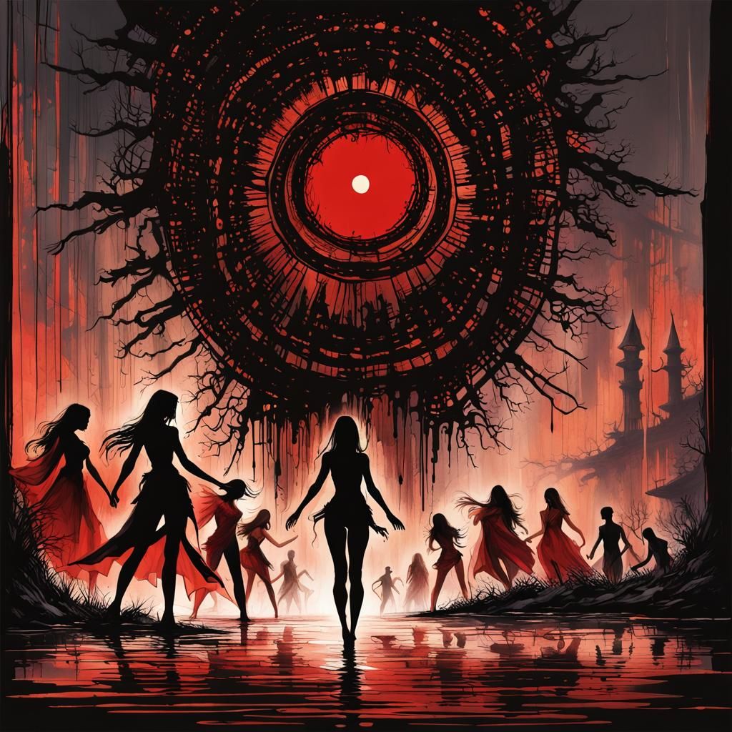 A group of beautiful ghostly ethereal female silhouette graces dancing in a foggy haunted swamp at dawn; art by Carne Griffiths, Amanda Sage, Android Jones, Bill Carman; Black bean, Dried blood, Rosewood, Blood red, Red oxide colors; 8k resolution concept art, hyperdetailed digital painting illustration, ...