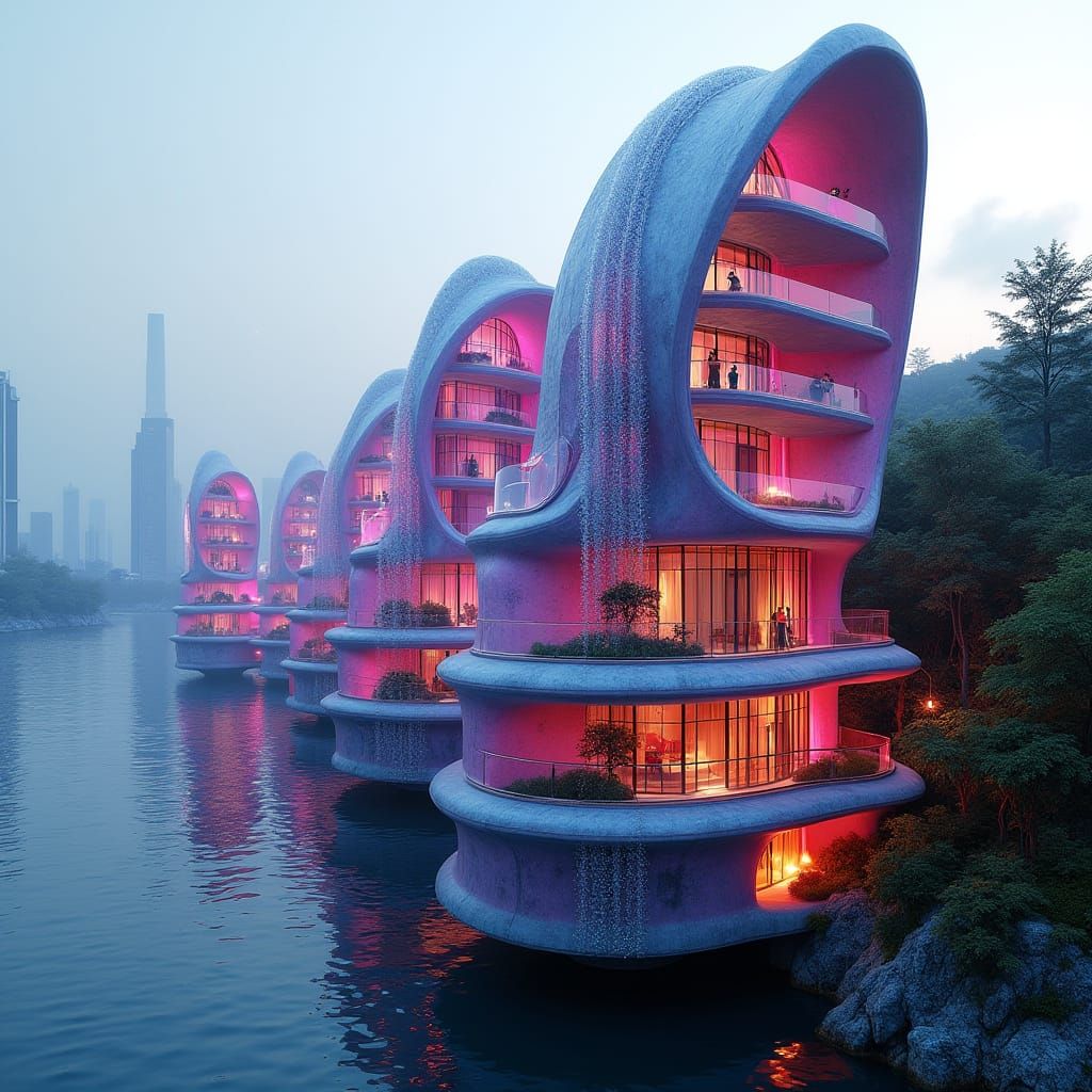 This futuristic cityscape features semi-circular skyscrapers emerging from a lake's edge, blending nature and technology in a delicate balance. Lush greenery and inhabitants thrive within, while exterior lights cast a warm ambiance on the urban landscape.