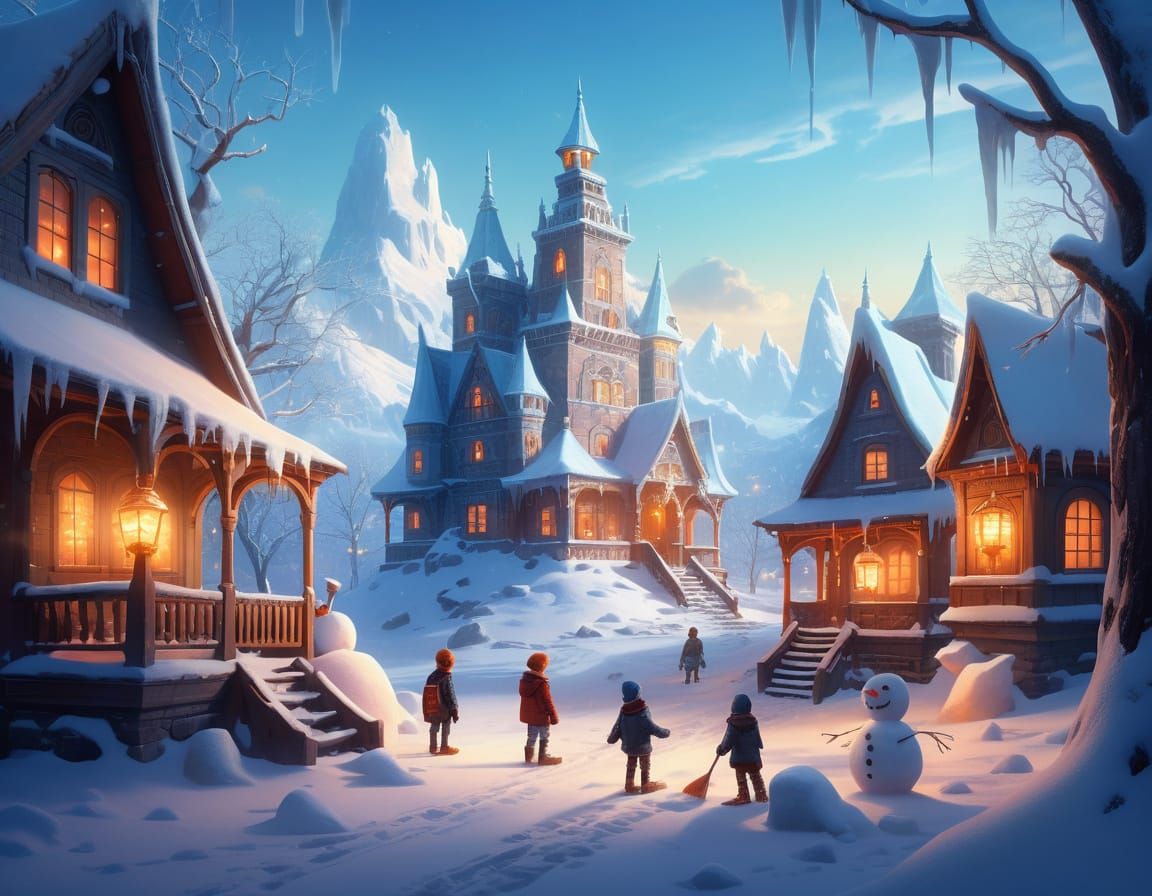 A fantasy art depiction of a wintertime scene featuring iconic landmarks and cozy hidden spots, snow-covered landscapes, shimmering icicles, warm glowing lights in windows, children building snowmen, and softly falling snowflakes, beautifully illuminated, intricate details, ethereal atmosphere, by artists like Artgerm and Greg Rutkowski, high resolution, 8k. [Negative Prompt: blurry, distorted, overly dark, modern elements]