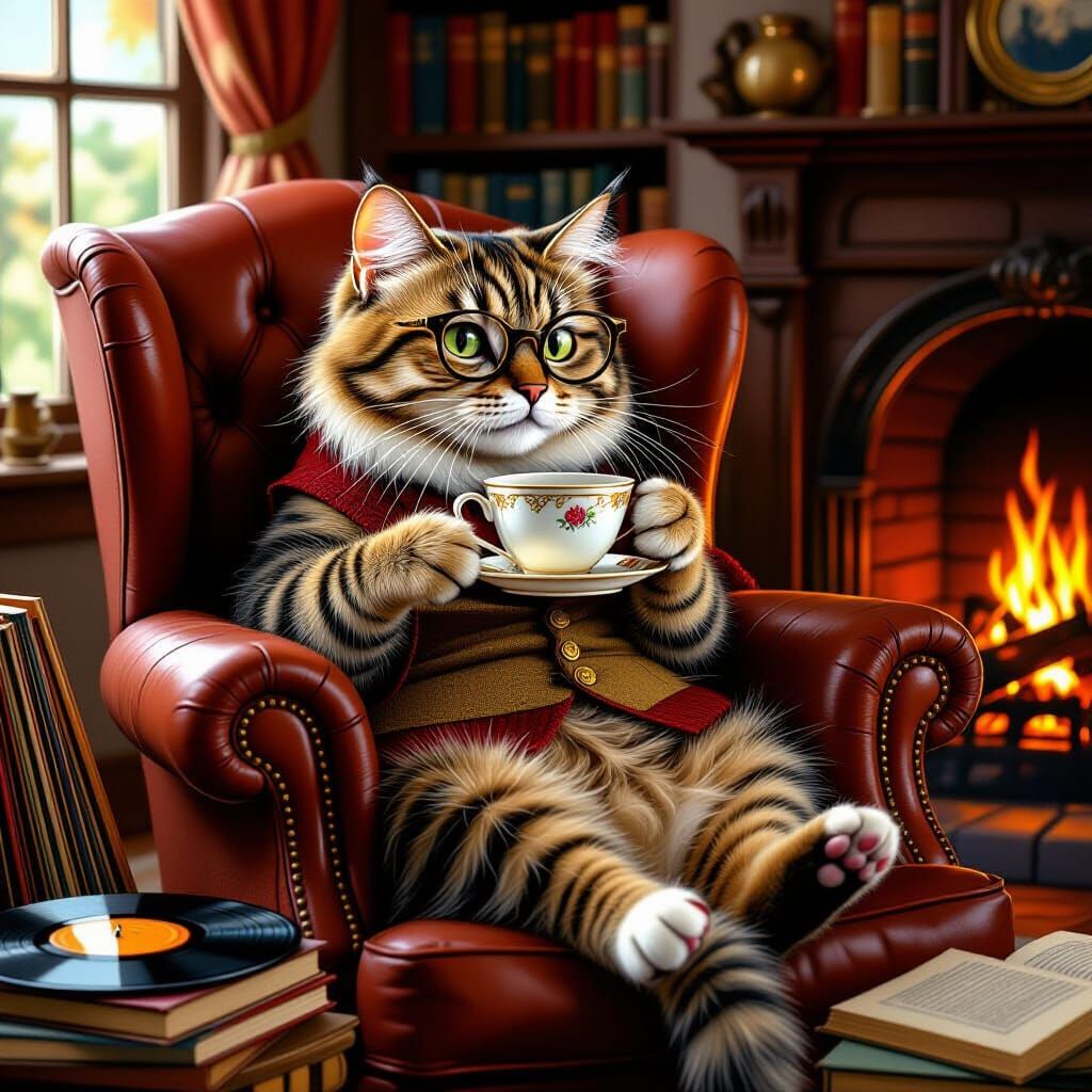 A heartwarming image of a cat embodying the 'Boomer' generation. The feline relaxes in an armchair with records and books, bathed in warm light. The scene is rendered in a cozy, illustrative style.
