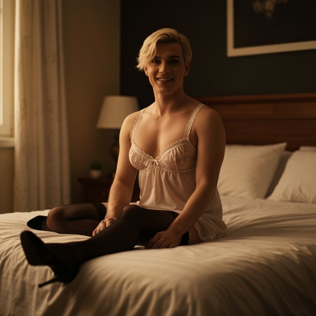 A serene young man with masculine features and blonde hair smiles confidently in a babydoll nightgown, stockings, and heels. This cinematic scene evokes intimacy with warm lighting and a shallow depth of field.