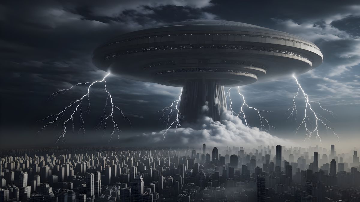 This image captures a breathtaking, otherworldly scene of an alien spacecraft emerging from a supermassive lightning storm, casting long shadows and illuminating a vast, sprawling city landscape at night with ethereal light rays.