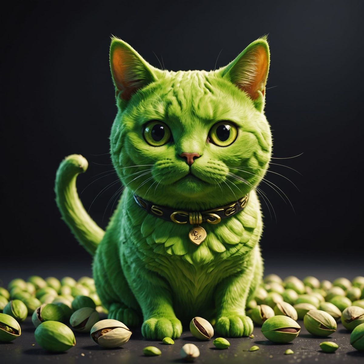 This image shows a beautiful pistachio-colored cat. It is rendered with vibrant colors and combines illustrative, photographic, and cinematic elements in a graffiti art style.