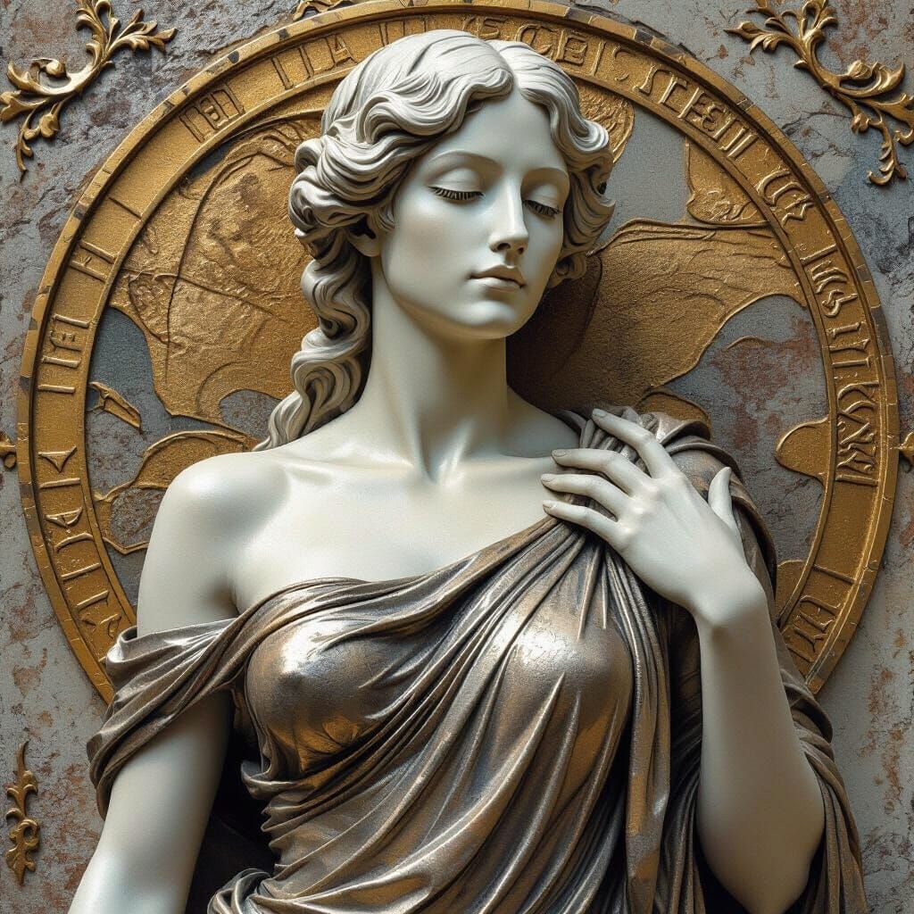 A captivating sculpture of an androgynous figure in flowing robes. The artwork blends masculine and feminine traits in a symbolic expressionist style with bronze textures and futuristic metallic elements.