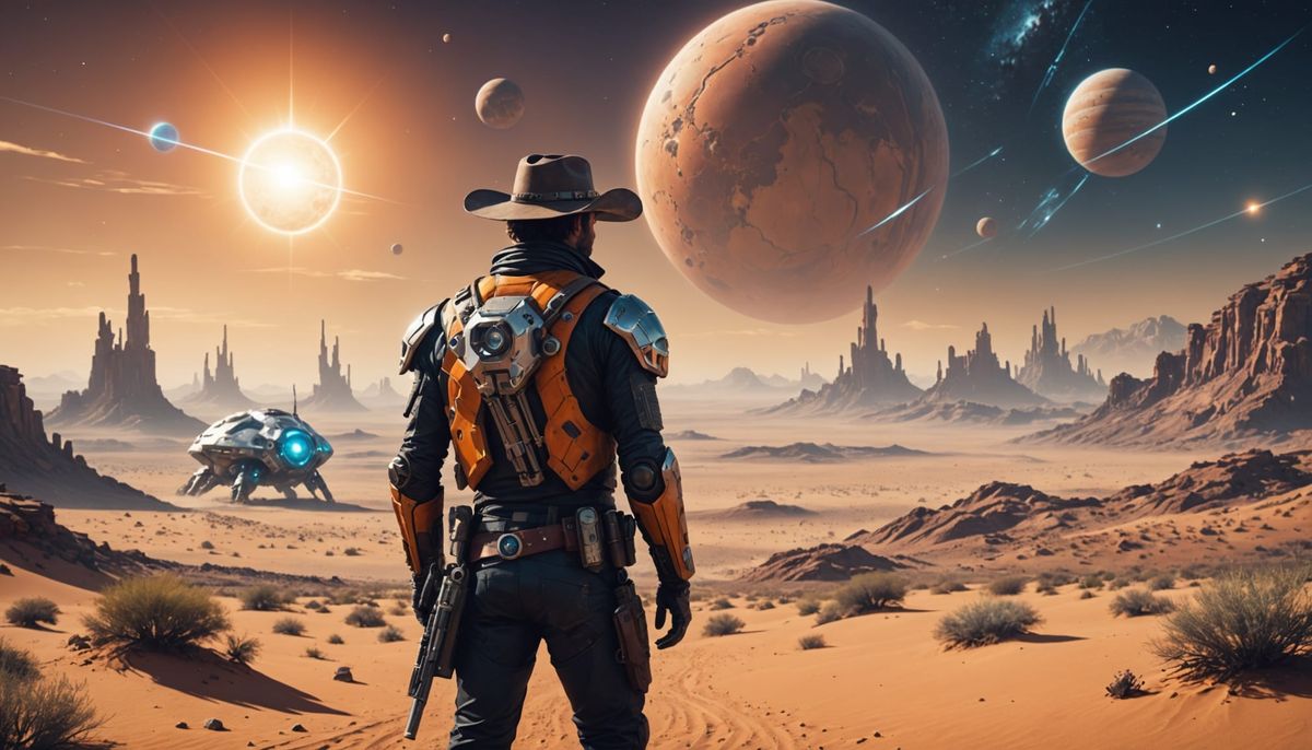 A lone futuristic space cowboy stands on a desolate desert planet, exploring the alien landscape. This image captures the essence of sci-fi adventure.