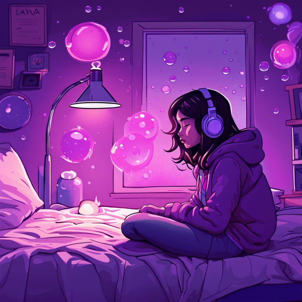 A digital drawing of a girl in a hoodie, lying on a bed, gazing at a lava lamp. The room is dark, and the lamp's light creates a stark, purple ambiance in a lo-fi aesthetic.
