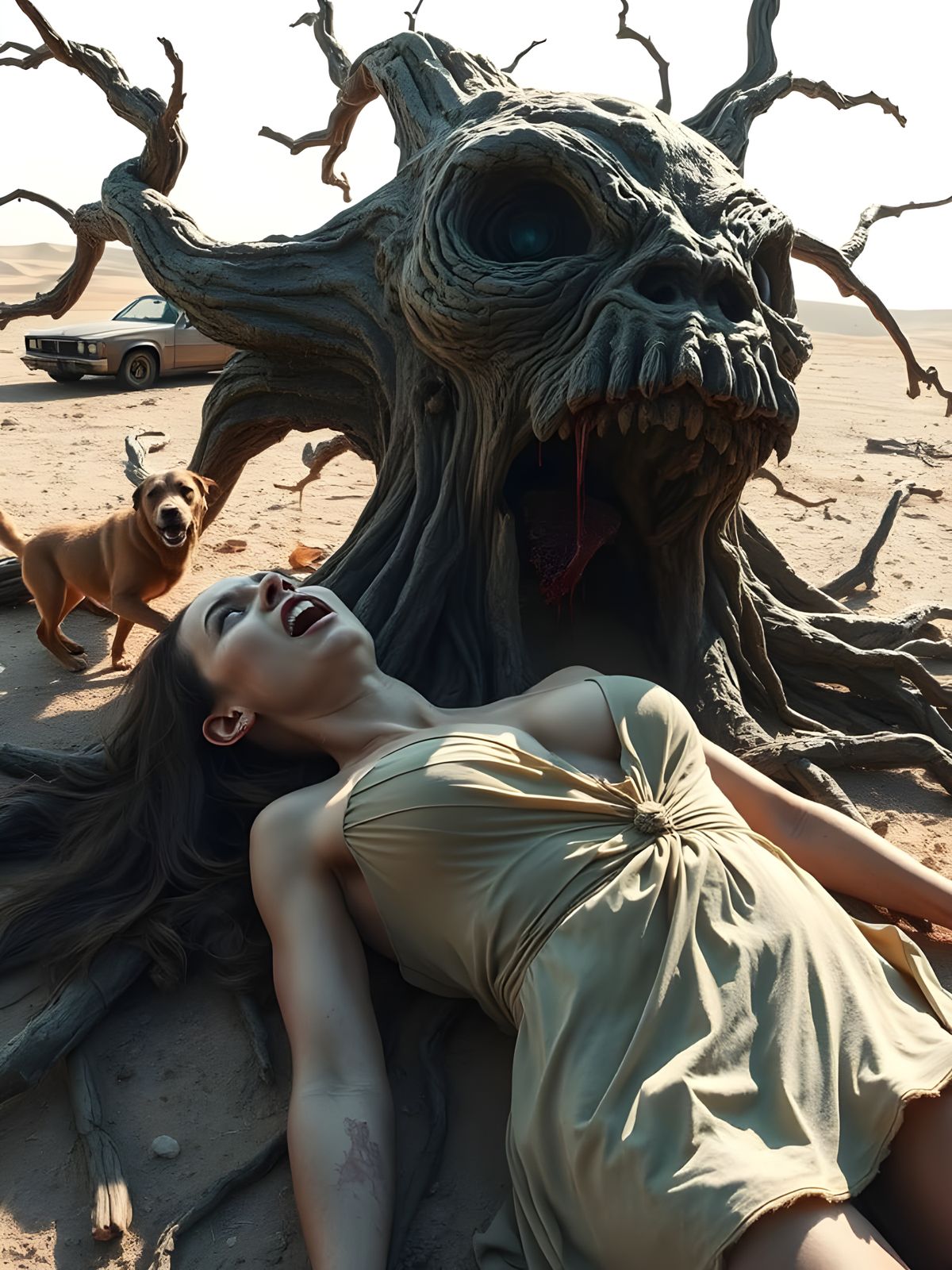 This image shows a surreal portrait of a screaming woman with a tree for a head. The body is partially decomposed with roots and branches sprouting from the torso, set in a desert landscape.