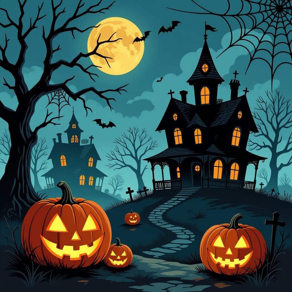 A striking picture of a Halloween scene featuring jack-o-lanterns, cobwebs, and haunted houses. The image has a dark gothic and mystical aesthetic.