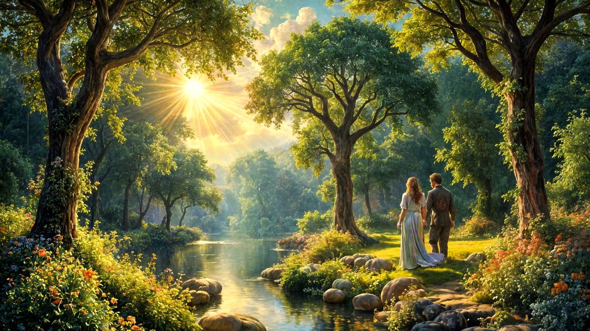 This image depicts a richly colorful, hyper-realistic Garden of Eden with Adam and Eve walking hand-in-hand. Features the Tree of Knowledge in the distance, set in a bountiful landscape with a river reflection and sunset.