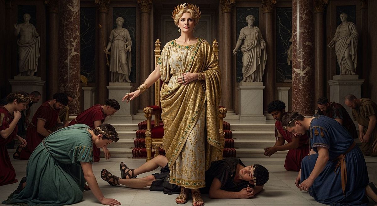 This image portrays a Roman Empress in an extravagant throne room, stepping on a defeated senator while peasants beg. The scene is captured with sharp focus and natural lighting, reminiscent of classical portraiture.