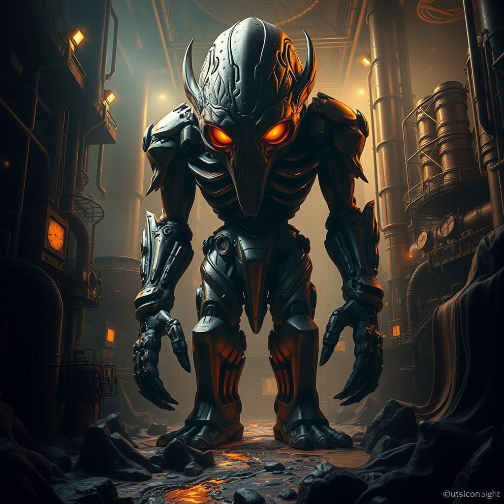 A striking picture of a chocolate golem guarding a chocolate factory. This digital artwork merges biomechanical horror with dark, futuristic visions, cinematic lighting and a palette of deep browns, fiery reds, and inky blacks.