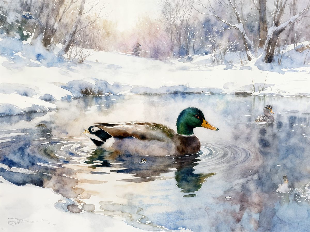 Side-view, from waterline-height, Portrait of a duck swimming in a pond on an beautiful, cold, and snowy winters day. A colorful watercolor painting with uneven, blurry, run-out, edges
