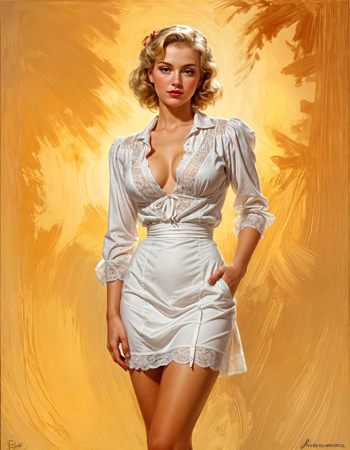 A classic 1950s-style pin-up portrait of a blonde woman with a confident expression. The artwork features elegant, flowing lines and a harmonious color palette, reminiscent of vintage oil paintings.
