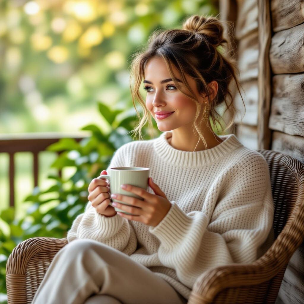 This hyperdetailed image captures a young woman in a knit sweater holding a coffee mug on a rustic porch during golden hour. Her gentle smile and the warm atmosphere create a tranquil scene.