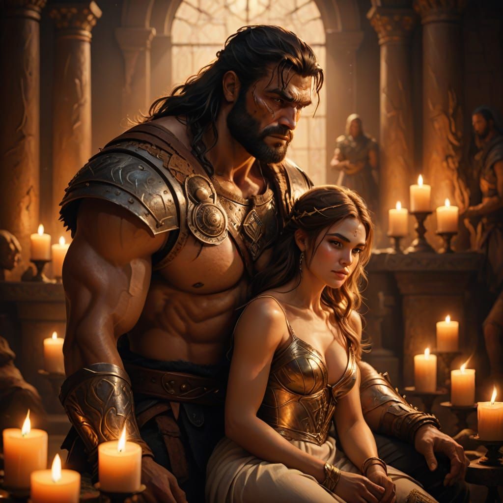 A tranquil scene of a rugged barbarian and a refined woman sitting together in a lavish, candlelit room, bathed in warm, golden light and soft shadows, highlighting their contrasting worlds.