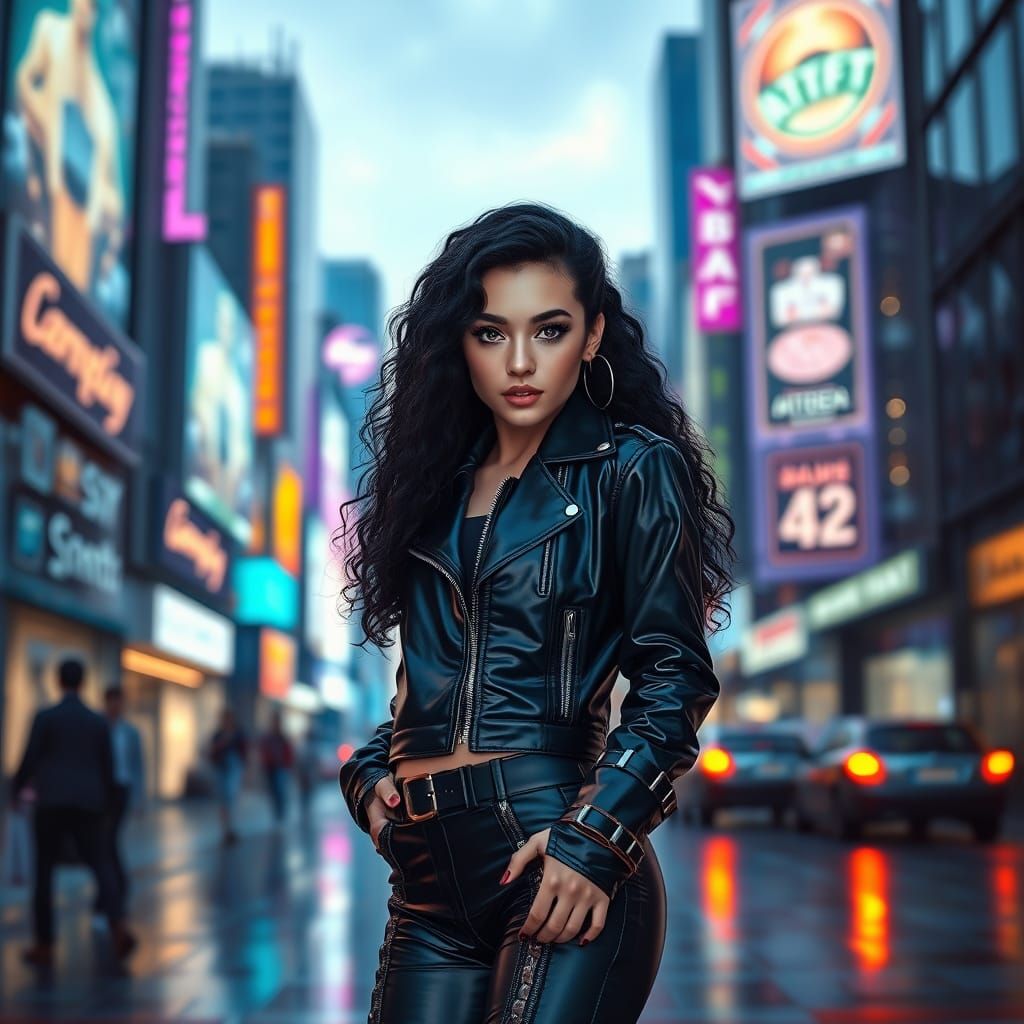 A vibrant digital painting of a young precious delicate russian woman embodying a cyber aesthetic, radiating futuristic charm and grace. She has striking long black curly hair styled in choppy layers and large, expressive brown eyes accented with subtle holographic eyeliner, her face displaying a playful, ...