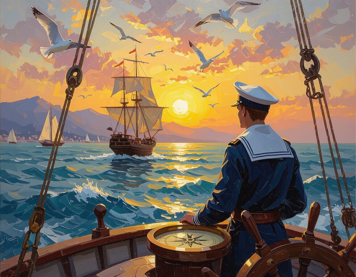 This image depicts Novorossiysk as a joyful sailor's city, with the sun as its guiding beacon. Features compass, sails, and helm against a backdrop of Tsemes Bay and Caucasus Mountains, rendered in a vivid oil painting style with impasto.