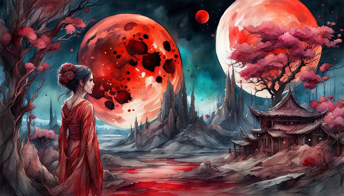 A surreal landscape under a blood moon. This digital watercolor illustration features intricate details, complex contrast, and soft cinematic lighting, rendered in flowery pastel colors, in a fantastical, complementary color palette.