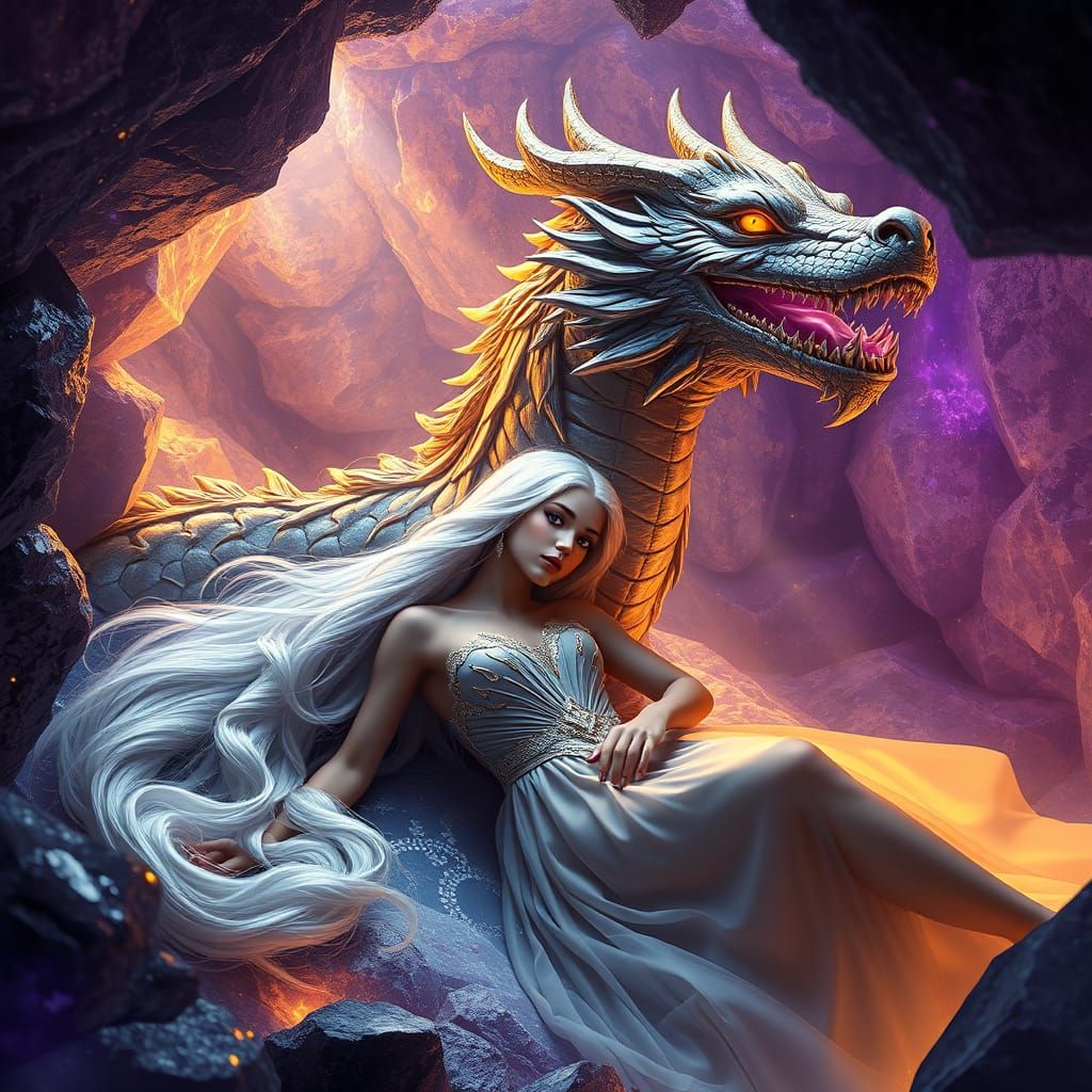 A captivating image of a woman with long silver hair in a crystal cave, reclining against a large silver dragon. The scene is illuminated with dynamic and volumetric lighting in dark fantasy art style.