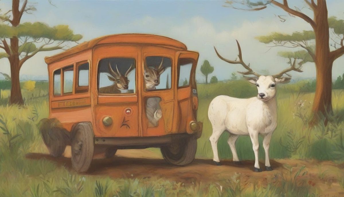 A maral Cervus elaphus and his cub step out of the thicket, curious about a school bus, in a vibrant gouache illustration with playful, expressive brushstrokes and earthy tones.