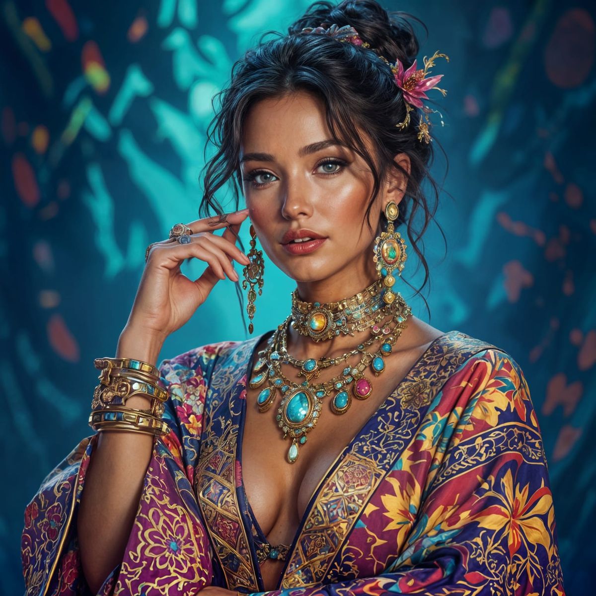 A hyperrealistic portrait of a beautiful woman adorned with colorful clothing and futuristic jewelry. The image is a detailed matte painting with deep color and intricate details, rendered in 8k resolution.
