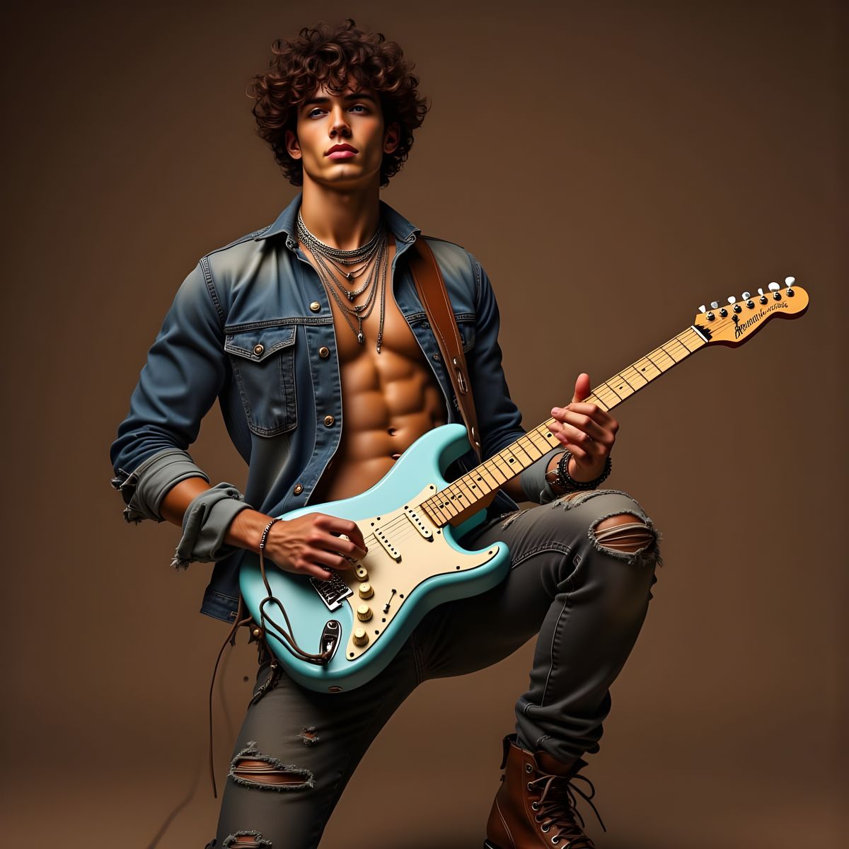 A striking picture of a muscular man playing electric guitar with raw energy. The image is digitally painted, focusing on realistic rendering of skin, fabric, and metal textures.
