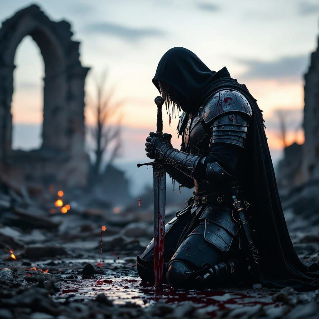 This image shows a dark knight in detailed, blood-smeared armor praying to his sword within a destroyed, roofless church under a twilight sky. A bloody moon casts an eerie glow through mist.