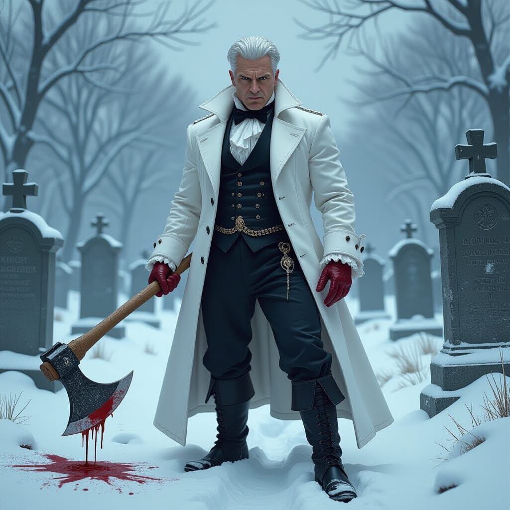 This image shows an angry old man in Victorian clothing holding a bloody axe in a snowy gothic graveyard. The scene is rendered as detailed matte painting with rich colors, reminiscent of fantasy concept art.