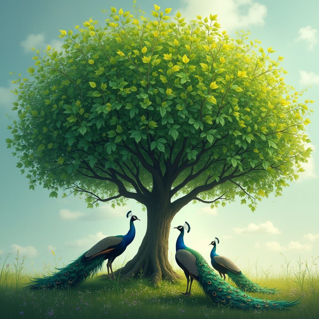 A vibrant tree with dewy leaves exudes a captivating fragrance, drawing peacocks to taste its leaves. This image showcases an organic aesthetic with delicate lines and vivid colors.
