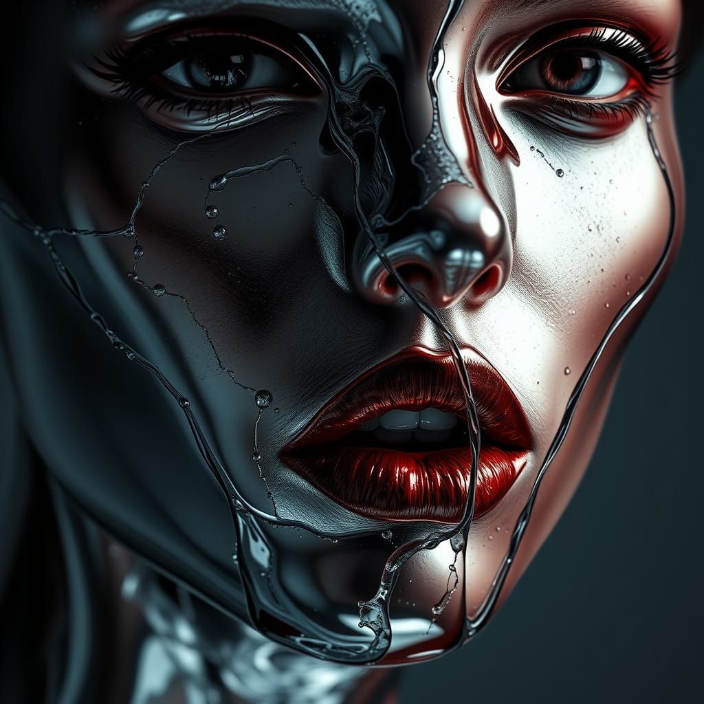Detailed art. Intricate textures and organic patterns. Subtractive lighting. Concept art, splash art, expressionism, impressionism. Chrome portrait. A portrait of a woman's face, entirely made of Chrome with dark red lipstick reflected in a polished chrome surface breaking through liquid mercury. The ...