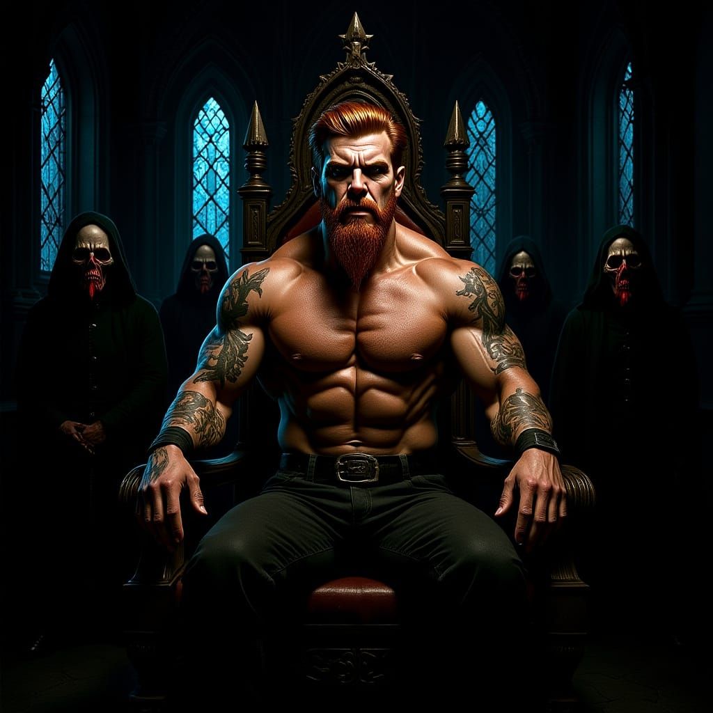This image shows a ginger-haired demonic wrestler with tribal tattoos enthroned in a gothic cathedral. Neon displays replace stained glass in this dark fantasy concept art.