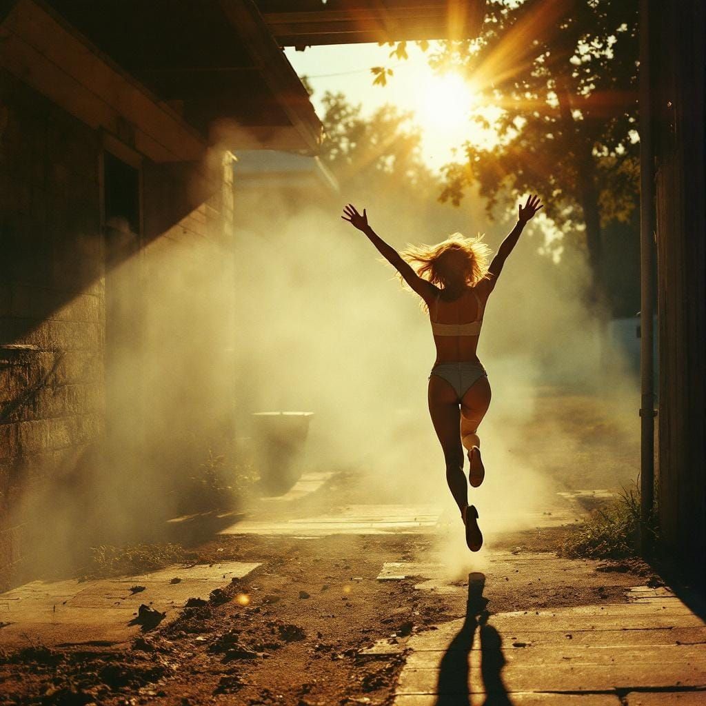A photograph capturing a figure in motion on a quiet street, reminiscent of 1970s-80s Southern photography. The image features saturated colors, golden hour lighting, and a film grain aesthetic.