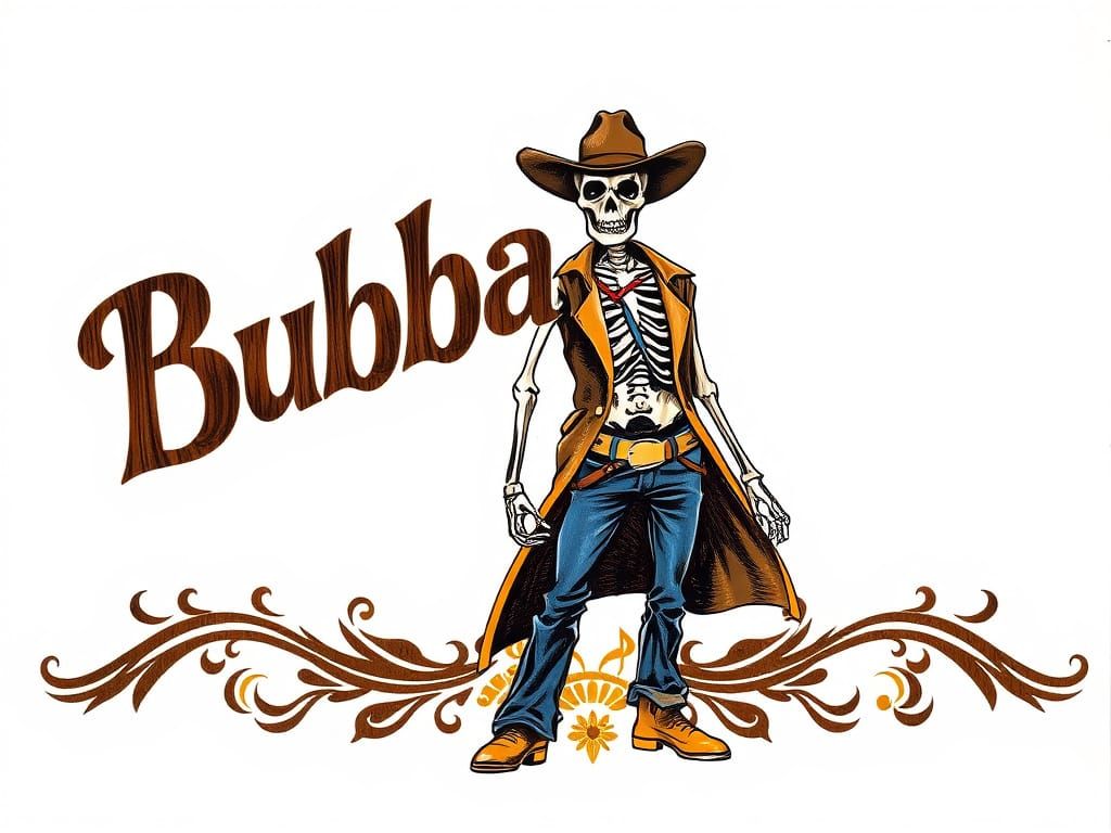 This image shows a wood grain Bubba logo with a cowboy skeleton. The design features dark brown, gold outlines, and tribal western patterns in an impasto style.
