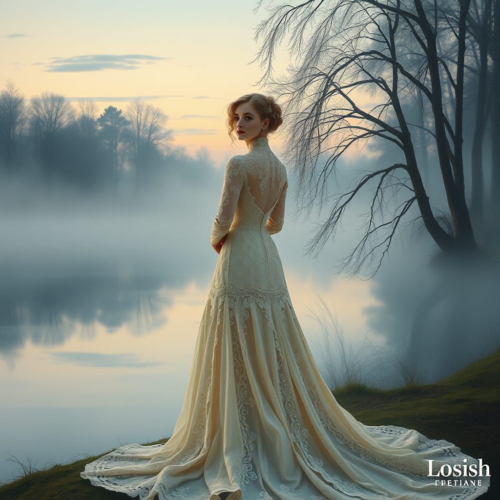 This image shows a Victorian lady in a detailed gown by a lake at dusk. Misty trees surround her, rendered with soft shadows and watercolor textures in an art nouveau style.