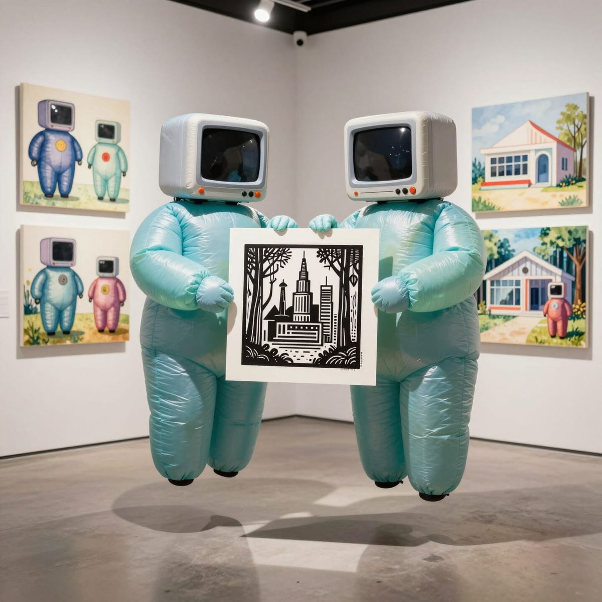 This image showcases photorealistic levitating quantum computers resembling inflated figures in an art gallery. The scene includes various artworks and is captured with sharp focus and natural lighting.