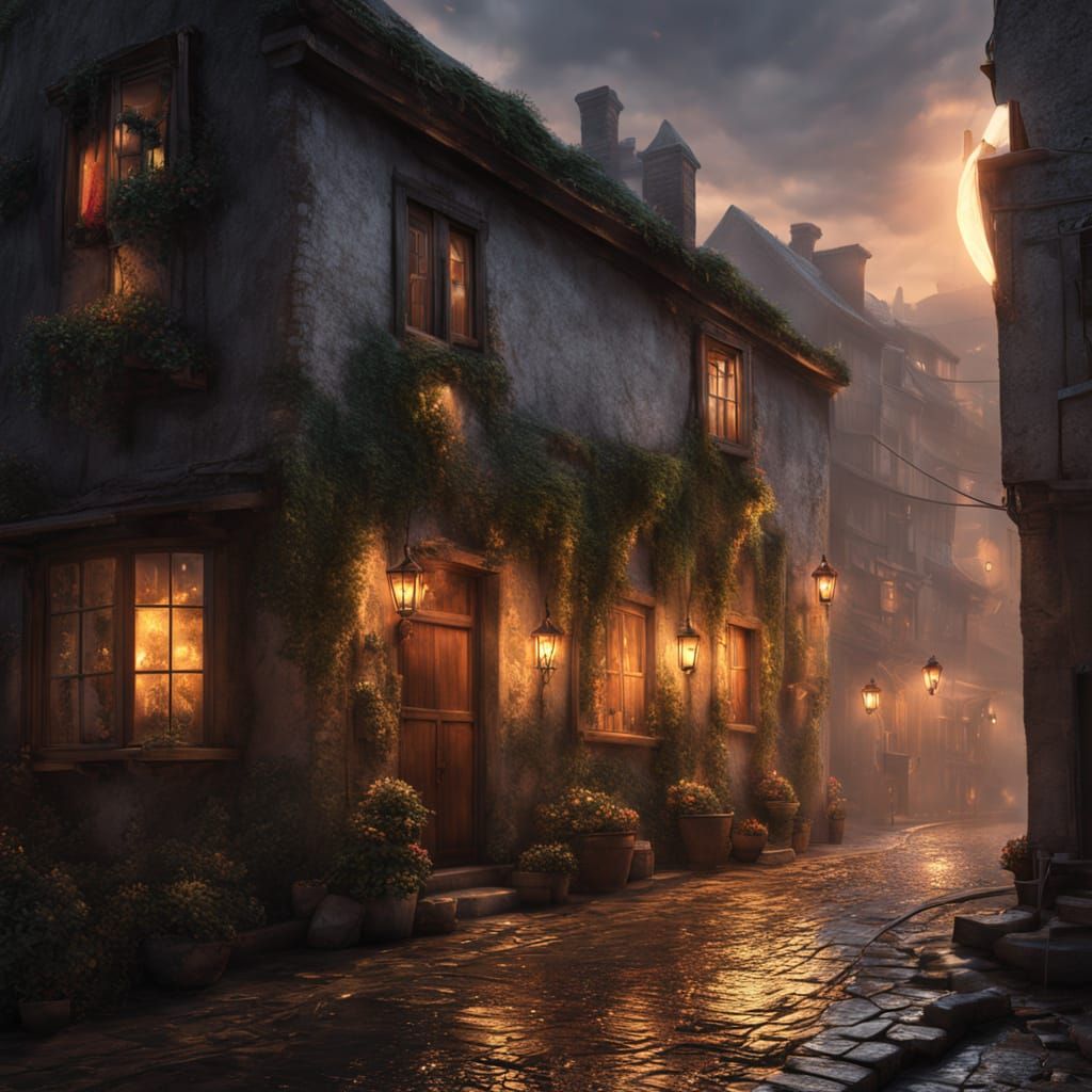 This image depicts a detailed fantasy tavern on a wet, cobblestone alleyway at night. Warm light emanates from the building, creating a cozy glow amidst the rain, captured with dynamic, cinematic lighting.