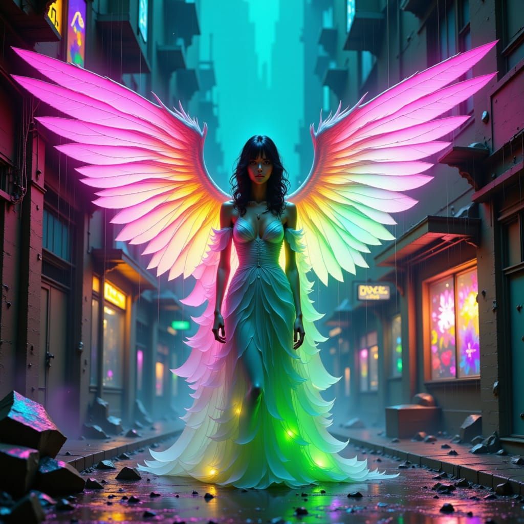 A divine angel with iridescent pink and green neon features appears in a gritty, rain-soaked cyberpunk city alley. The digital art blends celestial and dystopian elements with vibrant neon lighting.