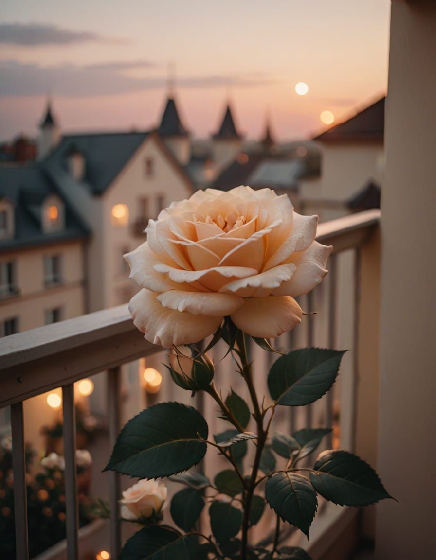 This image shows a cream-colored rose blooming on a balcony. Soft twilight shadows and warm golden light illuminate pastel clouds and a crescent moon in a dreamy, cinematic pastel style.