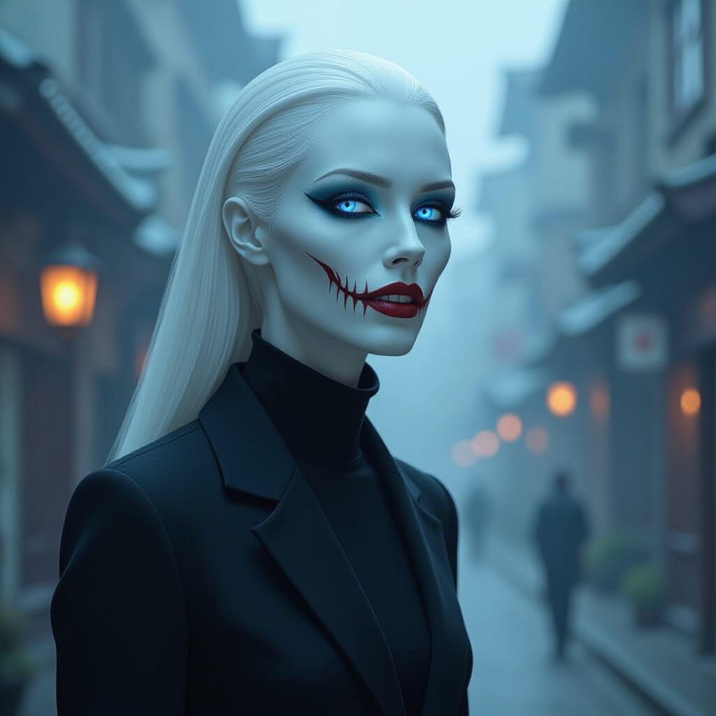 This image shows a pale Rokurokubi vampire with striking blue eyes, its elongated neck extended against a misty cityscape. The artwork evokes a dark, surreal atmosphere reminiscent of visionary science fiction art.